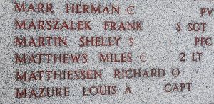 Capt Louis A. Mazure enlisted on 15 August 1941 at Fort Benjamin Harrison, Indiana and has been in England since September, 1943. Captain Mazure was squadron operations officer and command pilot during a part his of his service overseas.Capt Mazure was piloting this aircraft, flying lead for the 489th BG. The primary target was reported to be coastal installations at Boulogne-sur-Mer but actually was a V-1 Site, Wimereaux, North Boulogne. Departing the immediate area, they flew south, circled and flew parallel to the coastline, at the same altitude and airspeed, but as the enemy gunners had zeroed in on them, the first flak burst exploded off their port wing. Capt Mazure was killed when shrapnel sliced in under his helmet, and struck him in the head. Lt Carper, the co-pilot, immediately took over the controls.
