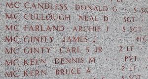 Pfc James J. Mc Ginity enlisted in Los Angeles, California on 9 October 1941.On 17 December 1944, together with the medics T/4 Michael Kardos and Pvt Robert Farley, he was taken prisoner by the medical detachment of Kampfgruppe Peiper of the 1st SS Panzerdivision Leibstandarte Adolf Hitler at Honsfeld. They were never seen again. Only the body of Michael Kardos was found. He is buried at the American Military Cemetery of Luxembourg.
