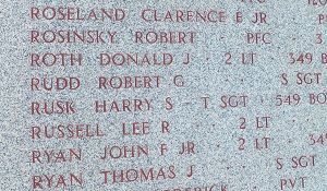 S/Sgt Robert G. Rudd was a chauffeur before he enlisted in Dallas, Texas on 13 April 1942.On 30 January 1945, Rudd was killed when his company attacked heavily fortified enemy forces near the town of Rocherath, Belgium. Due to intense fighting and fierce artillery shelling, Rudd’s body was unrecoverable.