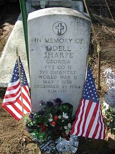 Pvt Odell Sharpe enlisted on 11 January 1944 at Fort Mcpherson, Atlanta, Georgia. He arrived overseas on 1 November 1944.On 18 December 1944, after defending the edge of a forest northeast of Krinkelt-Rocherath, the battalion was ordered to pull back toward Elsenborn. Upon reaching elsenborn, the column was stopped and ordered to return to the position from whence it came. A radio message had been misinterpreted and an withdrawal order had been issued. At dawn the following day, the 2nd Battalion reached its original position. They discovered the Germans had failed to take full advantage of the situation and a bayonet charge quickly ousted them.