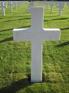 Sgt Clyde A. Vaughan enlisted on 3 March 1941 in Pasadena, California.The plane was attacked from behind by two and eventually 4 enemy fighters. Sgt Clyde A. Vaughan first reported that his oxygen system was out after the attack. However, Sgt Clyde A. Vaughan was hit in the face and his upper body by 20 mm enemy shells. He died almost instantaneously. S/Sgt Richard O. Tobias, Left Waist Gunner, was the last one to see him in his lethal condition. Sgt Vaughan was found near the plane by a French priest who was a Prisoner of War and worked in a Hospital in Lingen, Germany. One of the Waist Gunners was wounded and had been brought to this hospital. Here the French priest told him he buried Sgt Vaughan at the Lingen cemetery, in a section for Prisoners of War, and knew his name by means of the dog tags.