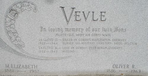 Lloyd Vevle joined the Air Corps of the U.S. Army Reserve at Jefferson Barracks, Missouri on 31 January 1943.Lt Wallace Storey, the pilot of another airplane in the same group, remembered what happened: "Flak was extremely heavy that day, and the Wing had been somewhat disrupted by the heavy opposition. We found ourselves on a crossing course with another Group and just after 'bombs away', the lead ship made a sharp descending right turn. Glancing to my right, I saw “Lazy Daisy” was sliding toward me. I pulled back on the control column to climb out of her path while keeping my eye on the # 2 ship of the lead element, Lt Buslee in #378 (43-37822), on whose wing our element was flying. I yelled for Gross to watch out for him to come out on the other side, and, sure enough, he slid under us and right into Buslee in the lead element. I watched the two planes as they collided. It cut #378 in half, and the wings on #222 folded up, and both planes fell in a fireball.”