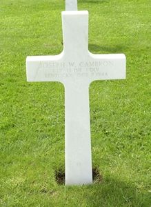 He was awarded the Distinguished Service Cross posthumously. The citation cited: For extraordinairy heroism in connection with military operations against an armed enemy while serving with an Infantry Company of the 18th Infantry regiment, 1st Infantry Division, in action against enemy forces on 8 October 1944, in Germany. Seriously wounded by a shell fragment as he led his platoon across an open field during an advance upon a pillbox, 1st Lt Cambron dragged himself to a nearby shell crater to locate the source of the withering machine gun, automatic weapons and small arms fire which pinned his platoon to the ground. After crawling back to his squad leaders to issue necessary orders, when he was spotted by the enemy and again wounded. Despite intense pain, he remained staunch and directed effective fire upon the strongpoint to cover the withdrawal of his men. Observing a squad leader struck by a hail of bullets from the pillbox, 1st Lt Cambron, although twice wounded, dragged himself across a completely exposed sector to the aid of his wounded sergeant. Again the object of devastating enemy fire, 1st Lt Cambron was fatally wounded as he attempted to pull the sergeant to safety. First Lieutenant Cambron`s fearless leadership, personal bravery and zealous devotion to duty at the cost of his life, exemplify the highest traditions of the military forces of the United States and reflect great credit upon himself, the 1st Infantry Division, and the United States Army.