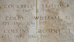 William Colby enlisted on 11 September 1942 at Hartford, Connecticut.He was taken prisoner in the vicinity of Schönberg, Belgium. He was held prisoner in Stalag IV-B in Mühlberg, Germany. It is assumed he died in Bad Sulza during a forced march and was initially buried at the cemetery of this town. From this cemetery two sets of remains were disinterred in February 1953, of which was believed they were of Sgt Colby. They were labeled as Unknown X-7638 and X-7641 and evacuated to Ardennes Cemetery. After investigation no positive identification could be established.
