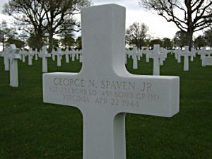1st Lt George N. Spaven Jr. attended high school for four years and enlisted in Richmond, Virginia on 5 February 1941.Spaven´s A/C was hit by flak at approximately 1938 hours SW of Hamm. The #2 engine caught fire and the A/C fell out of formation. Four chutes were seen. The A/C then was brought under contol and Spaven regained altitude and rejoined the formation. After an undetermined period of time, the A/C was observed to leave the formation and head West, still under control.