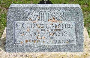 Pfc Giles was in a foxhole when an enemy artillery shell burst in a nearby tree and a piece of shrapnell struck him. He was killed instantly.