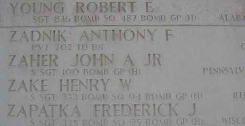 S/Sgt John A. Zaher was an attendant at a filling station before he volunteered for the Air Corps of the Army of the United States at Fort Hayes Columbus, Ohio on 5 December 1942.Eyewitnesses state that the 'Sassy L' or 'Sassy Lassy' was hit by flak as bombs were released. The aircraft disintegrated and no parachutes were seen. Later reports suggest it may have been bombs from another B-17 that destroyed the 'Sassy L'. There is no confirmation of this and the fate of the aircraft will probably never positively determined. The Casualty Report states the plane was hit by flak in the bomb bay. All 9 crewmen were killed. Six are listed on the Walls of the Missing at Margraten. The remains of William F. Edmondson and Herman F. Herhamer returned to the Unites States and Ralph O. Ingalls is buried at the American Military Cemetery of Lorraine.