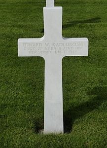 S/Sgt Edward W. Kadluboski enlisted at Newark, New Jersey on 16 May 1941. He was sent overseas in August 1944.On the morning of 17 December, elements of Kampfgruppe Peiper (1st SS Panzer Division) entered Ligneuville, Belgium and captured Company A's kitchen crew and its supply crew. They were transported to an area south of Stavelot called La Vaulx-Richard. The German commander decided that the men be murdered. So 12 men of Company A, and three Belgian civilians were executed. They were S/Sergeant Walter Arter, S/Sgt Edward Kadluboski, T/5 William Edmonds, T/5 Donald Spencer, T/5 Klaas Visser, Pfc Harry Czaplinski, Pfc Carl Millard, Pfc Belen Reyes, Pfc Rolf Runge, Pvt Gion, Pvt David Glotzer and Pvt Donald Hoffer.