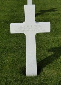 Pfc Delroy L. Kern enlisted in Allentown, Pennsylvania on 7 June 1943. A graduate of Franklin Independent High School in 1941 Lehighton High School in 1942, he was employed by the Donald Eckman lumber yard before his induction. He was reported slightly wounded in action October 14 in Bardenberg, Germany and died of his wounds the next day. He was sent to New Cumberland and then to Camp Haan, California where he received training with an anti-aircraft unit. He was then transferred to Carson, Colorado and in August went overseas and landed in England. He saw action in Belgium and France.
