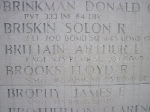 Brittain's father was Captain T.P. Brittain (retired) who spent thirty years with an army medical detachment and served in World War I. He stated that his son's army age was 19 years, but added that the boy quit school to enlist in June 1942. Arthur Brittain attended Hyattsville High School and St. John's School in Washington.Arthur E. Brittain hitchhiked 2,500 miles in May 1943 to rejoin his outfit after being quarantined in Newfoundland with the Mumps. He and his buddy, Sgt Alfred Meyers of Nutley, N.J., had trained together with their bombardment echelon out in the West before they wound up in a Newfoundland hospital, just at the time when the rest of their group left for England. Eighteen days later, the "orphans" of the squadron emerged from the hospital. A major whom they were to see about their orders had returned to the United States. So they saw a colonel, who arranged for them to go as extra baggage on a Skymaster cargo-transport plane, headed for England. They got to the airfield destination of the transport with exactly a dime between them. Then they talked the army's Railroad Transport Office out of two railroad tickets for themselves and got to a replacement center somewhere in England. Intelligence officers at that point finally located the American bomber group to which Brittain and Meyers belonged, and they at last rejoined their outfit. Two days later, they went on their first raid.