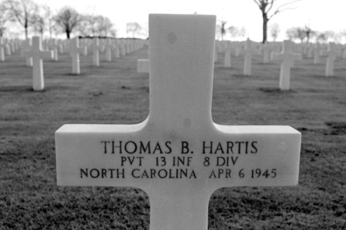 Pvt Thomas B. Hartis enlisted at Camp Croft, South Carolina on 9 March 1943.He had been reported wounded in action twice. The first time was on 8 September 1944 in France and the second time on 24 January 1945 in Germany. For these wounds he was awarded the Purple Heart Medal two times.
