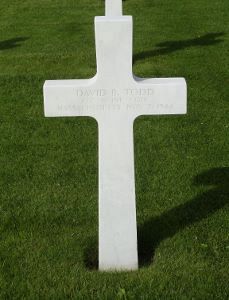 Pfc David B. Todd enlisted in Boston, Massachusetts on 7 October 1943. He attended high school for 4 years. During his time at Huntington School for Boys he won a number of academic awards in subjects as diverse as French, Chemistry and History. Each year he earned a scholarship medal. He was a member of the tennis team and the manager of the track team. During his junior year he was awarded the "Harvard Prize" book, given to the outstanding member of the class. During his senior year, he was the editor of the school publication. When he graduated from school in June of 1942, he was the highest ranking student in the class. He was one of the only four members of his senior class to be elected to the Cum Laude Society. He went on to attend Darmouth University. However, that only lasted for a year since he entered the service.His brother Charles N. Todd, is buried at Margraten Cemetery.