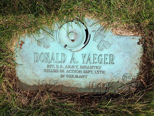 Sgt Donald A. Yaeger enlisted on 23 January 1942 at Camp Grant, Illinois.He is remembered at the River Hills Memorial Park, Batavia, Kane County, Illinois.