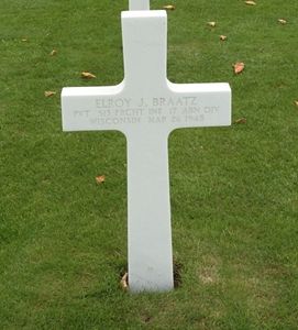 Pvt Elroy J. Braatz was aboard a C-46 aircraft in Serial A-5, 313 TCCG, 9th TCC scheduled to drop by parachute into Drop Zone W. Due to a smokescreen and disorientation of the aircraft, his unit was dropped 2.5 miles northeast of the drop zone east of a railway line and 1.5 miles southwest of Hamminkeln, Germany. After landing, his unit fought its way to within 1 mile northeast of Diersfordt where he was killed.