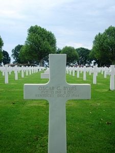 Pvt Oscar G. Byers enlisted in Louisville, Kentucky on 18 February 1943.He was a member of a three-man reconnaissance patrol which was sent into the Hurtgen Forest, near Obermaulbach, Germany in December 1944. His unit attacked and took all the ground along the patrol route.