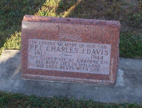 Pfc. Davis was first buried at the Temporary American Military Cemetery of Molenhoek near Nijmegen.Pfc Charles J. Davis is remembered at Maplewood Cemetery in Saint Elmo, Fayette County, Illinois.