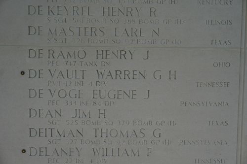 DeVault’s name is recorded on the Walls of the Missing at Netherlands American Cemetery, an American Battle Monuments Commission site in Margarten, Netherlands, along with the others still missing from World War II. A rosette will be placed next to his name to indicate he has been accounted for.