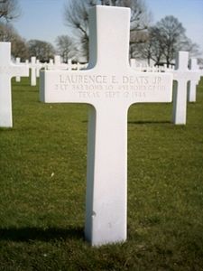 Lt Laurence E. Deats Jr. graduated from Ball High School where he played football. He was employed as a bookkeeper by the Tood-Galveston Dry Docks Inc.He joined the Air Corps of the U.S. Army Reserve in Houston, Texas on 9 September 1942 and was sent overseas in June 1944.