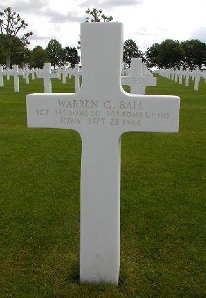 Sgt Warren G. Ball worked on a farm. He enlisted at Camp Dodge, Herrold, Iowa on 25 August 1943.The airplane was flying in the low squadron of the Group. There were twelve airplanes in the squadron, of which only two returned to base. The formation was subjected to severe and intense fighter attacks in the vicinity It is definitely established that also this airplane was lost due to these attacks, but no one could be found who could say definitely what happened.