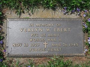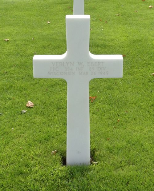 Pvt Verlyn Elbert arrived in Europe in January 1945.A letter, written to one of his comrades, tells of his death: "We were together until 25 March, when we made the spearhead across the Rhine river. We were to make a dawn attack across the river on the morning of 26 March. We were loaded into landing barges, 14 men to a boat. I was on boat No. 8, and he (Ebert) was on No. 9. We started across to make the attack at 2 a.m. We were about half way across, when the Germans opened up on us with everything they had. We were helpless, for we couldn't fire back at them. The boat he was on received a direct hit, exploded, and killed every man that was on it. He was killed right out, and his body sank. He didn't suffer one bit. So you see why he was reported missing until his body was found. His body was recovered from the Rhine 21 April. He and the rest of the men were buried in a cemetery over here. I don't know just exactly where it is. He had a military burial along with the rest."