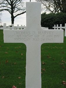 Thomas D. Harvey graduated from Cass High School in Detroit with the class of 1942.He volunteered for the Air Corps of the Army of the United States in Detroit, Michigan on 18 December 1941. He later volunteered for the paratroopers. He received training at Fort Benning, Georgia; Camp Forrest, Tennessee; and Fort Bragg North Carolina. He had been overseas since July 1944.