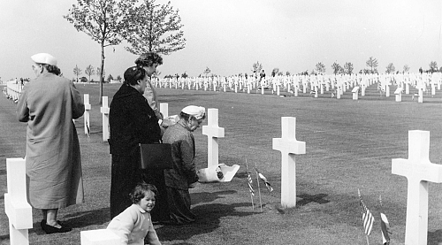 One picture shows his mother, kneeling at the grave of her son on Memorial Day 1959. A few days later she visited the grave of her other son Fred in Luxembourg.