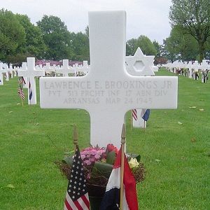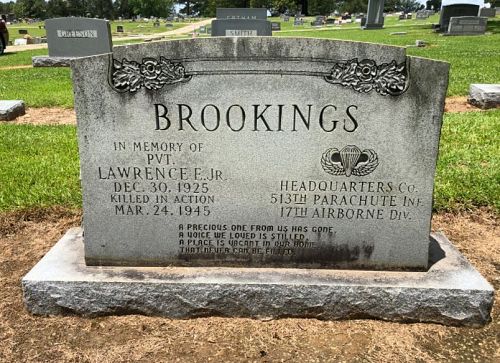 Pvt Lawrence E. Brookings Jr. was aboard a C-46, that was scheduled to drop his passengers onto Drop Zone X. However, smoke on the ground caused the unit to be dropped 1.5 miles north of the drop zone between two railway lines east of the Diersfordt Forest and west of Hamminkeln.He is remembered at the Oakland Cemetery in Monticello, Arkansas.