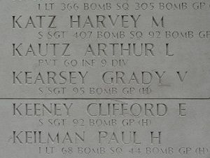 S/Sgt Grady V. Kearsy joined the Air Corps of the Regular Army in Pittsburgh, Pennsylvania on 8 October 1940.S/Sgt Kearsey followed his older brother, Robert, to western Pennsylvania's steel mills. He had been an usher at Fulton Theater, where his brother, Gordon, was assistant manager. His brother Robert enlisted in the Army as well, and the brothers were sent to Puerto Rico. There, Grady Kearsey asked for "active duty". Robert Kearsey was transferred to a base in Langley, Virginia, after his brother's death, but felt guilty about finishing the war as a stateside gunnery instructor and returned to active duty. Gordon Kearsey enlisted in the Naval Aviation forces.