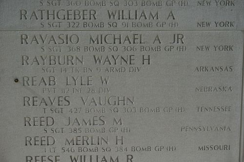 Reab’s name is recorded on the Walls of the Missing at Netherlands American Cemetery. A rosette was placed next to his name to indicate he has been accounted for.