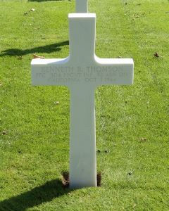 Pvt Kenneth B. Thomson was employed by the Southern Pacific Railroad before he enlisted at Fort MacArthur, San Pedro, California on 17 February 1942.He was killed when a mortar grenade hit the kitchen of the house where the command post of E Company was situated at that moment. One other member of the company, Pvt Morris, was killed instantly and Sgt Amos E. Overholt died of his wounds on 8 October in a hospital in England. He is buried at the American Military Cemetery of Cambridge. Seven men were wounded. A plaque on the wall of the house remembers this event.