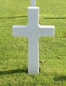 Pfc Bernard J. Van Der Steen was sent overseas in December 1944 or January 1945.Pfc Van Der Steen was initially buried at the Temporary American Military Cemetery of Breuna #1, Germany on 16 April 1945. According to the IDPF his entire body was burned. He was evacuated to Margraten and buried in a temporary grave on 14 July 1945. He was given his final resting place on 21 December 1948.