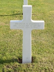 In November 1945 two graves, marked as "Two unknown American Soldiers" were discovered in Plasmolen. The remains were evacuated to Margraten, where Pfc Closen was previously buried as Unknown X-2063 on 28 November 1945. He was identified through tooth chart comparison, a laundry mark and a gold ring with the initials FEC. He was given his final resting place on 13 December 1948.