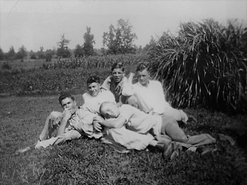 In the group photo, Sgt. Harris, called Parnell by his family, is the second from the left. His brother Cecil Harris, who also served in WWII in Burma and China, is on the far right. This photo was taken the day before Sgt. Harris left home to go to Europe.