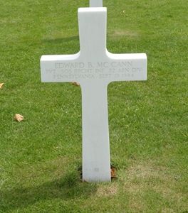 Pvt Edward B. Mc Cann graduated from Altoona High School with the class of 1940. He worked as a painter in the Pennsylvania railroad car shops department.He enlisted in Altoona, Pennsylvania on 3 August 1942 and saw action in North Africa, Sicily, Ireland, England and Normandy.