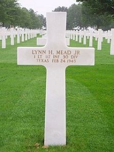 He was awarded the Bronze Star Medal posthumously. The citation cited: 1st Lt Lynn H. Mead Jr. is awarded the Bronze Star for heroic achievment on 2 January 1945, in Belgium. Lt Mead voluntarily led a reconnaissance patrol on a particularly hazardous mission of crossing a wide river into enemy territory to determine exact hostile troop dispositions and to captured an enemy prisoner. Due to his outstanding skill, initiative, and courage displayed under fire when the patrol was discovered by the enemy, Lieutenant Mead successfully accomplished his mission, returning his men back to the company area without casualty.