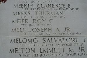 Joseph Meli graduated from New Utrecht High School and attended Brooklyn College for two years.He volunteered for the Air Corps of the Army of the United States in New York City, New York on 14 January 1942. He received his wings at Roswell, New Mexico and was sent overseas in April 1942.