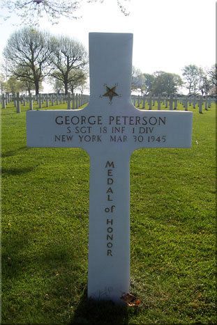 George Peterson was awarded the Congressional Medal of Honor posthumously for his bravery while serving with K Company, 18th Infantry near Eisern, Germany in 1945.He was an acting platoon sergeant with Company K, near Eisern, Germany. When his company encountered an enemy battalion and came under heavy small-arms, machinegun, and mortar fire, the 2nd Platoon was given the mission of flanking the enemy positions while the remaining units attacked frontally. S/Sgt. Peterson crept and crawled to a position in the lead and motioned for the 2nd Platoon to follow. A mortar shell fell close by and severely wounded him in the legs, but, although bleeding and suffering intense pain, he refused to withdraw and continued forward. Two hostile machineguns went into action at close range. Braving this grazing fire, he crawled steadily toward the guns and worked his way alone to a shallow draw, where, despite the hail of bullets, he raised himself to his knees and threw a grenade into the nearest machinegun nest, silencing the weapon and killing or wounding all its crew. The second gun was immediately turned on him, but he calmly and deliberately threw a second grenade which rocked the position and killed all 4 Germans who occupied it. As he continued forward he was spotted by an enemy rifleman, who shot him in the arm. Undeterred, he crawled some 20 yards until a third machinegun opened fire on him. By almost superhuman effort, weak from loss of blood and suffering great pain, he again raised himself to his knees and fired a grenade from his rifle, killing 3 of the enemy guncrew and causing the remaining one to flee. With the first objective seized, he was being treated by the company aid man when he observed 1 of his outpost men seriously wounded by a mortar burst. He wrenched himself from the hands of the aid man and began to crawl forward to assist his comrade, whom he had almost reached when he was struck and fatally wounded by an enemy bullet. S/Sgt. Peterson, by his gallant, intrepid actions, unrelenting fighting spirit, and outstanding initiative, silenced 3 enemy machineguns against great odds and while suffering from severe wounds, enabling his company to advance with minimum casualties.