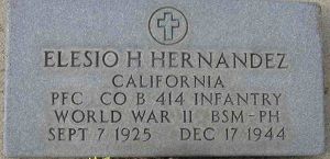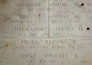 Pfc Elesio Hernandez worked on a farm before he enlisted in Los Angeles, California on 30 December 1943.His remains were recovered. He is buried at Tulare Cemetery in California. He is permanently listed on the Tablets of the Missing at Henri-Chapelle.