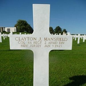 Col Mansfield graduated from Military Academie in 1938. His first station after graduation was Brooks Field, Texas. From 1929 until 1931, he served in the Second Cavalry Division at Fort Riley, Kansas. The summer of 1929 he became a member of the Cavalry Rifle Team and fired both rifle and pistol at Camp Perry in the National Rifle Matches and National Matches.He was killed while on a personal reconnaissance. An hour before the reconnaissance he had been awarded the Silver Star Medal for gallantry in action on 6 and 7 January 1945. According to Maj Gen Collier, Mansfield left his CP with one of his tank company commanders to size up his objective for the next day. There was deep snow on the ground. Evidently they were observed and killed by a direct hit of an 88 MM shell from a Mark V tank. When they were reached by medics, the Silver Star was still pinned to Mansfield´s field jacket.