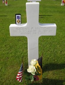 He was sitting in the back of a truck when somehow a wrecked friendly tank, towed by a recovery vehicle incidentally turned the turret. The barrel of the tank hit the skull of Michael and he died shortly after. Four other men were also killed during this incident, Wilbur T. Fields, Howard W. Morrison, Charles P. Ricotta, Sidney W. Samuels.