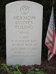 Hermon D. Poling worked as a lineman. He enlisted in Huntington, West Virginia on 13 July 1942.Returning from a bombing mission to Kassel, Germany the limping aircraft was attacked by a German fighter and was shot down. 8 crewmembers bailed out but were attacked by the German aircraft. From a crew of ten, two died in the aircraft, six died as a result of the strafing, and the other two were captured by German ground forces.