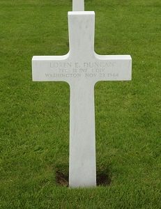Pfc Loren E. Duncan enlisted in Spokane, Washington on 15 December 1942. He attended college for 3 years and was a teacher before he enlisted.Source of information: Peter Schouteten, Raf Dyckmans, www.wwiimemorial.com, www.archives.gov, www.ancestry.com – WWII Enlistment Record / My Duncan Huet Family Tree / 1920 census, www.history.army.mil/html/bookshelves/resmat/ww2list.html
