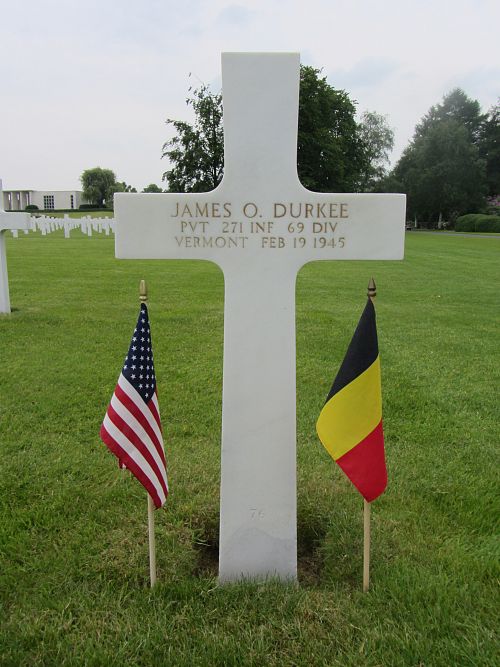 Pvt James O. Durkee enlisted at Fort Devens, Massachusetts on 7 April 1944.On 19 February 1945, Col Mc Cormick, commander of the 271st Infantry Regiment, called for volunteers to mount a patrol to proceed to a specific point before Büschem, Germany and then return. A patrol of 13 men was formed under the command of 2nd Lt Bill Ricker. It moved out across a small stream and up a long gradual hill to the south of Buschem and then disappeared from sight. Shortly thereafter, the sound of gunfire and mortars penetrated the mid-afternoon quiet. Within minutes, the remains of Ricker's patrol came running back to the 271st lines.