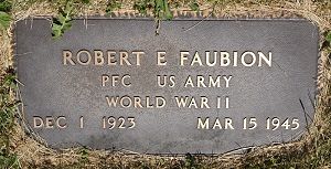 Pfc Robert E. Faubion enlisted at Camp Dodge, Herrold, Iowa on 19 August 1942. He was sent overseas in January.Source of information: Peter Schouteten, www.wwiimemorial.com, www.ancestry.com - Skinner Mary Elizabeth 2012 / WWII Enlistment Record, www.findagrave.com - Diane and Don, www.newspapers.com - Des Moines Tribune