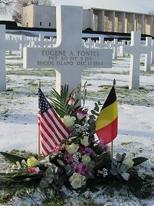 Pvt Eugene A. Fontes enlisted in Providence, Rhode Island on 18 October 1943.He was awarded the Distinguished Service Cross posthumously. The citation cited: For extraordinary heroism in connection with military operations against an armed enemy while serving as a Medical Aidman with the 60th Infantry Regiment, 9th Infantry Division, in action against enemy forces on 13 December 1944, in Germany. When a sergeant was severely wounded by shell fragments during a hostile artillery concentration, Pvt Fontes voluntarily crossed a fire-swept field to reach the wounded soldier. He was administering medical treatment when the sounds of an approaching shell were heard. Disdaining cover, he shielded the wounded man with his body. The shell landed nearby, killing Pvt Fontes instantly. The heroic and selfless actions of Private Fontes prevented further injuries to his wounded patient. His intrepid actions, personal bravery and zealous devotion to duty at the cost of his life, exemplify the highest traditions of the military forces of the United States and reflect great credit upon himself, the 9th Infantry Division, and the United States Army.