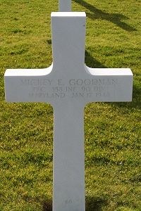 Pfc Mickey E. Goodman was first buried at Temporary American Military Cemetery Foy, Belgium Block B, Row 1, Grave 1.He attended two years of high school before he enlisted on 6 November 1943 at Fort Myer, Virginia.