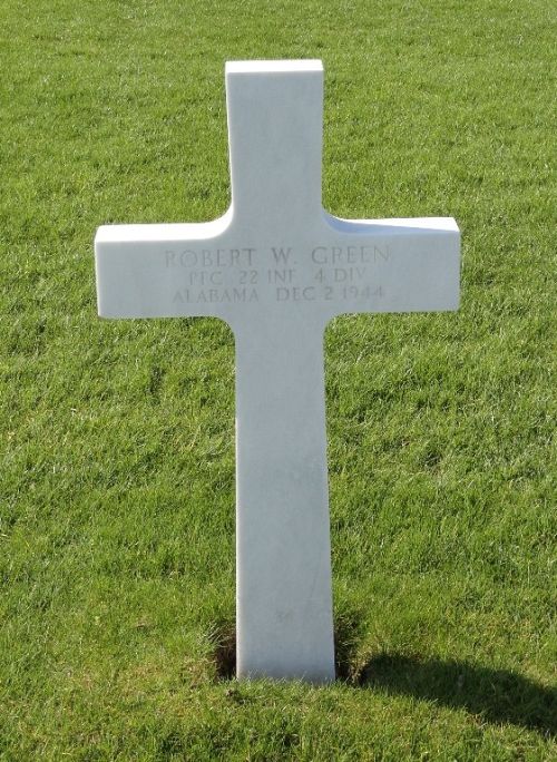 Pfc Robert W. Green worked on a farm before he enlisted at Fort McClellan, Alabama on 21 January 1942.Source of information: Danny van der Groen, Carla Mans, www.abmc.gov, www.wwiimemorial.com, www.archives.gov - WWII Enlistment Record, www.ancestry.com - Headstone and Interment Record / U.S. WWII Draft Cards Young Men