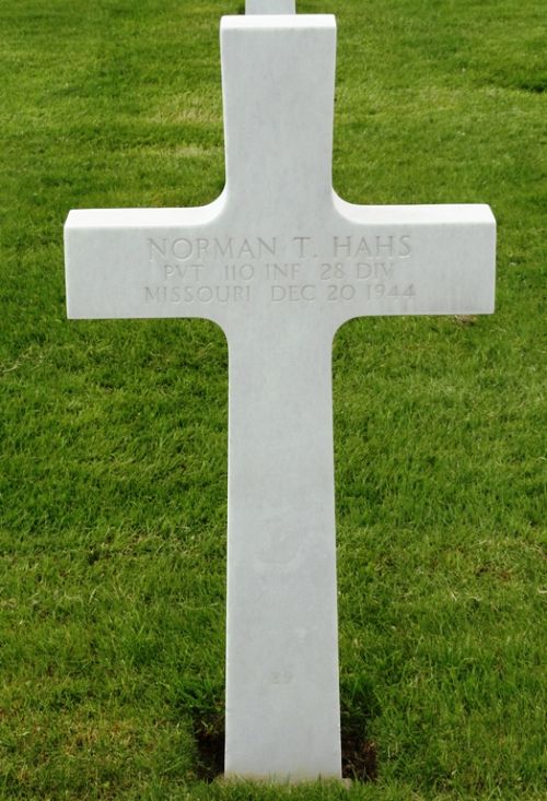 Pvt Norman T. Hahs enlisted at Jefferson Barracks, Missouri on 13 April 1944.He was killed along with 5 other soldiers (Mangin, Thorpe, Binder, Callen and Hudzinski) and was buried in Munshausen cemetery. There was a service in the old chapel and the bodies (two to a wooden box) were buried in the church yard.