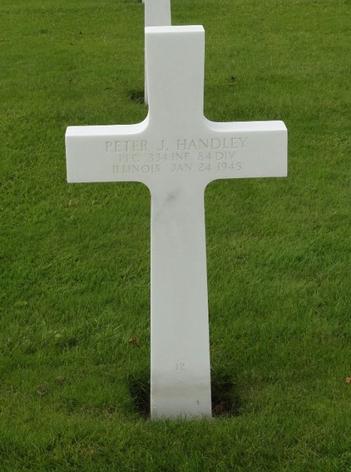 Pfc Peter J. Handley enlisted in Minneapolis, Minnesota on 15 December 1942.He was killed in infantry action in Belgium during the Battle of the Bulge.
