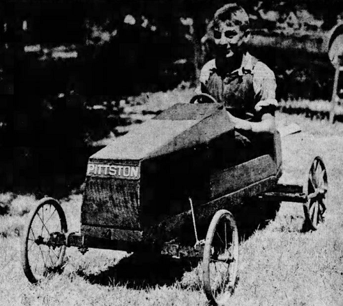 On the picture, he proudly shows his soap box racer, made of dynamite boxes, which he build himself and in which he participated in a race in his hometown in July 1935.